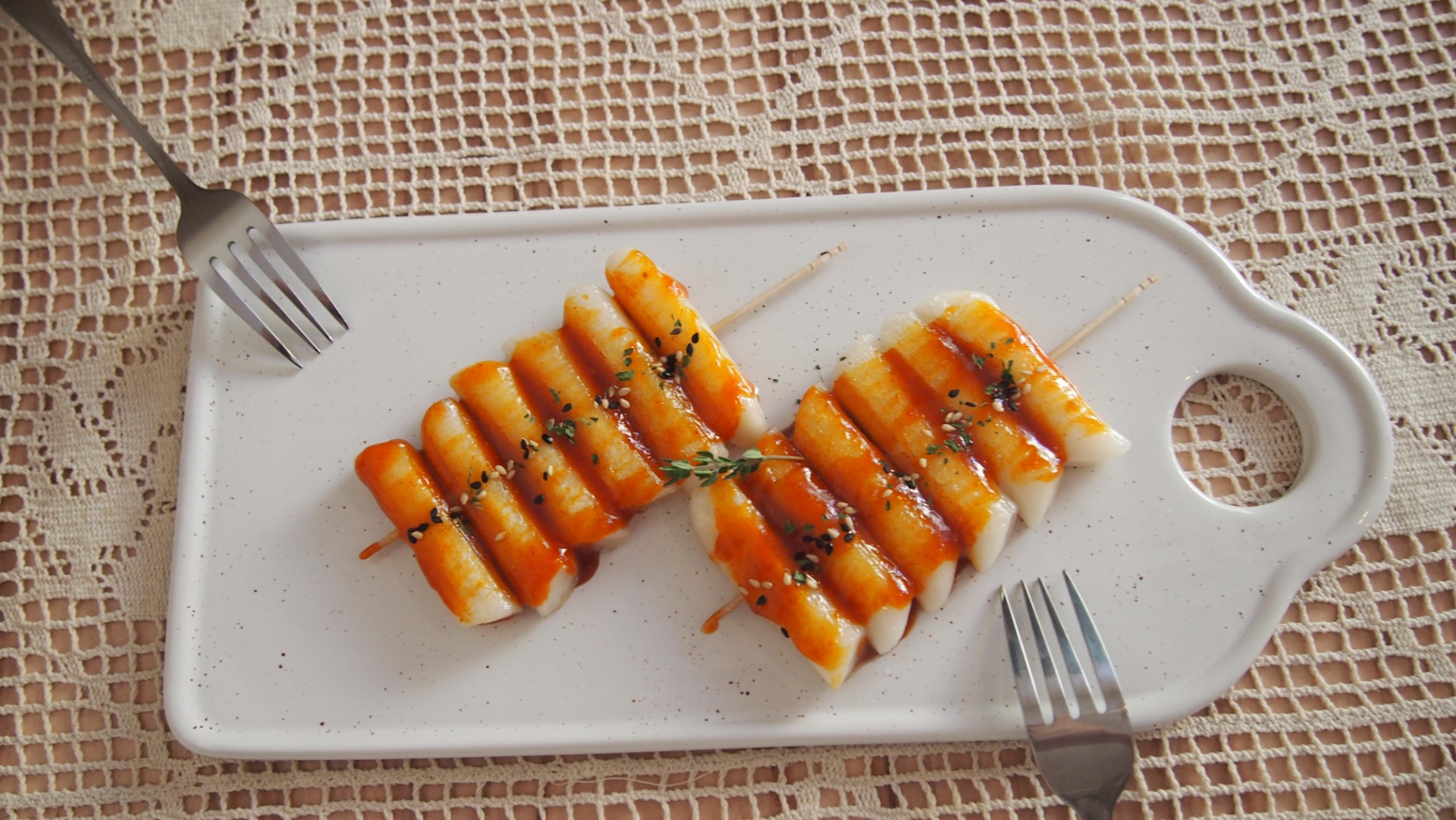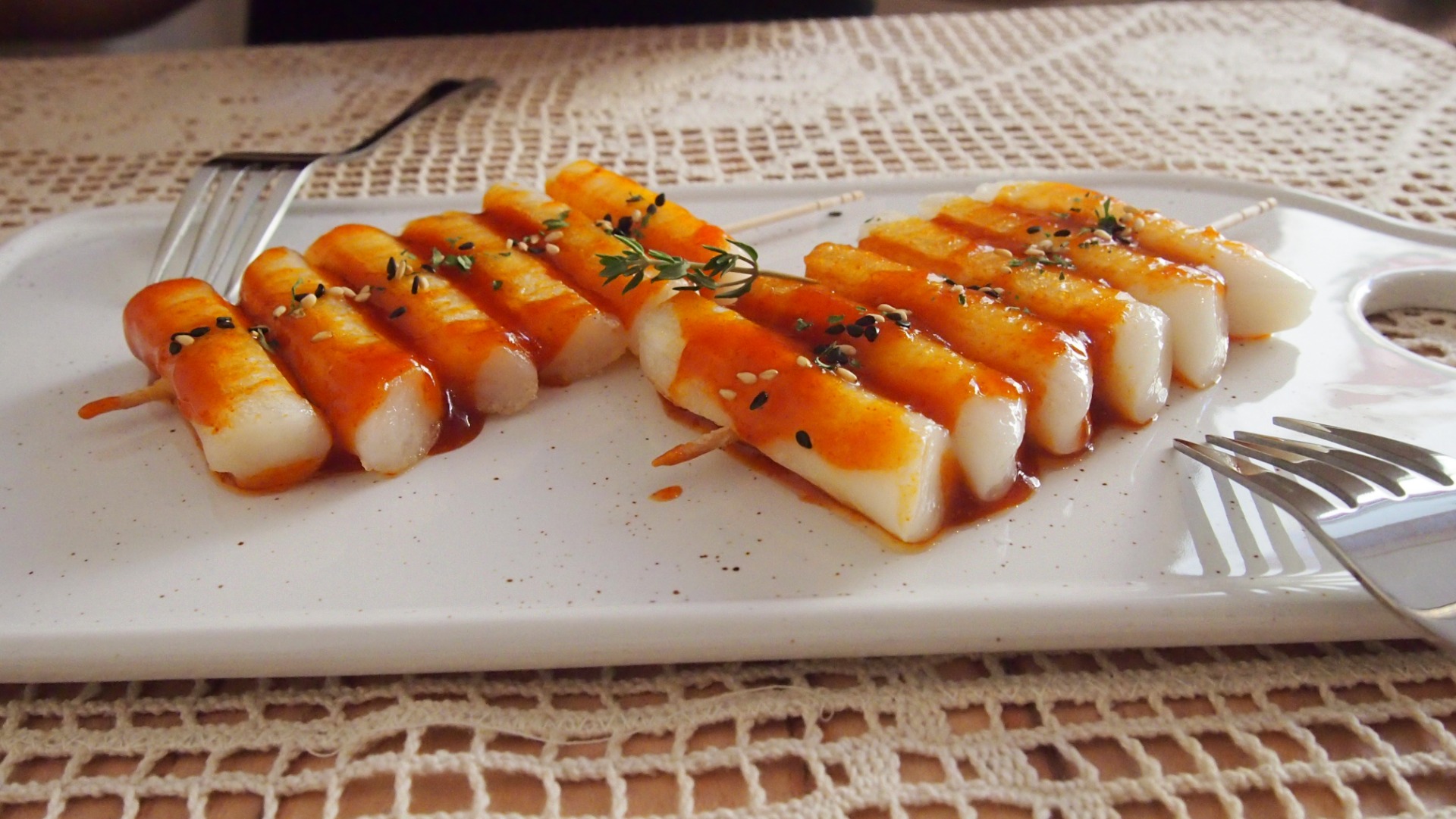 Tteok kochi- Smažené rýžové koláče s pikantní a sladkou omáčkou